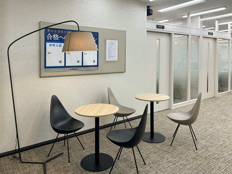 エントランスホールにはコンパクトなカフェテーブルとチェアで待合スペースを設置。来訪者や生徒が待ち時間をゆったりと過ごせるエリアとして活用できるようにました。