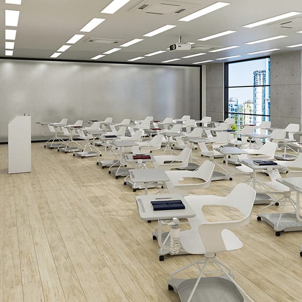 授業ごとのレイアウト変更も手軽に行えるキャスター付きデスク。アクティブラーニングやセミナールームに最適です。