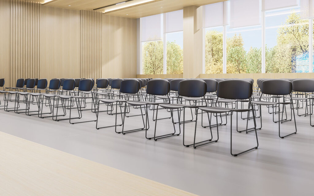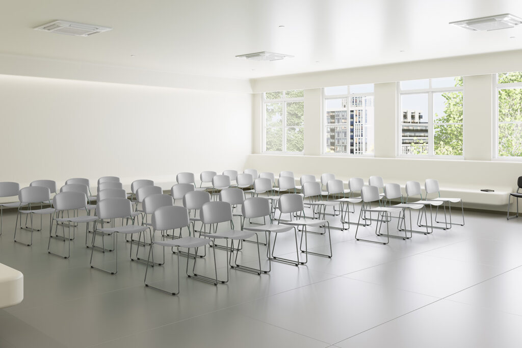 フォリオ チェアは1脚の重さが3.7Kgの軽量設計。最大8脚までスタッキングが可能なため、レイアウト変更を頻繁に行うセミナールームや会議室、また清掃で移動させることの多い食堂、休憩室にもおすすめです。