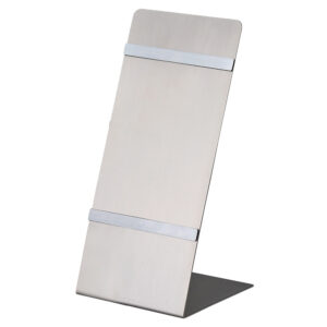 | シンプルで美しいインフォメーションボードA5用。本体と同色のマグネットバーが2本付属しており、掲示物(コピー用紙5枚重ね程度)をしっかりと固定できます。A5サイズの用紙が縦向きに収まるサイズで少し長めの用紙も掲示可能です。A5用は床置きで、展示のキャプション掲示や段差注意等の注意喚起や誘導のフロアサイン、スタンドサインとしてご利用いただけます。 | |