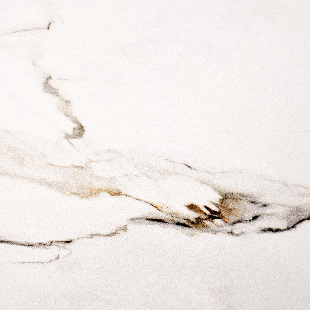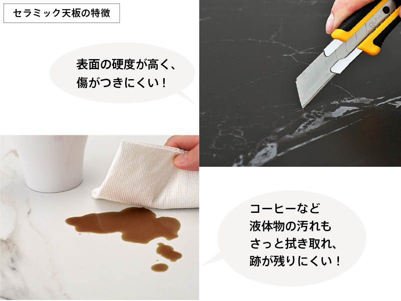 高級感のある石目の自然な表情が魅力の大理石風セラミック天板は、冷たすぎず滑らかで心地よい手触り。耐熱性、耐久性、耐水性、耐薬品性にも優れ、経年劣化にも強いため美しさを長く保てます。