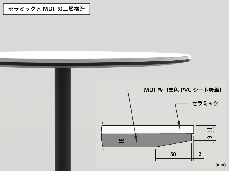 リスタカフェテーブルのセラミック天板は、厚さ11mmのセラミックと18mmのMDFの二層構造により、たわみに強い厚みを確保。また、MDF部分はテーパー加工により使用時にたわみの少ない安定感とシャープな外観を実現しています。